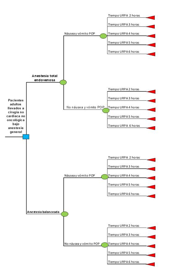 Debido a que no existe evidencia fuerte a favor de una técnica sobre otra en la mayoría de los modelos quirúrgicos, y que los desenlaces clínicos primarios no son diferentes entre ambas técnicas, el estudio está planteado en términos de evaluar solo los costos relacionados con la aplicación de ambas técnicas. En ese sentido, para la estimación de los costos, se realizó un árbol de decisiones reflejando las posibles rutas que puede tener un paciente que es sometido a un procedimiento anestésico de acuerdo con los eventos diferenciales entre ambas técnicas: presencia o no de náusea o vómito postoperatorio y el tiempo que toma el paciente en la URPA hasta el alta. Esta opción de análisis permitió generar una estructura lógica para el problema abordado e incorporar la evidencia de las alternativas que se están evaluando con el objetivo de comparar los entre ellas (Figura 1).