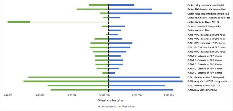 Se realizaron análisis de sensibilidad tanto determinístico como probabilístico. En el análisis determinístico se modificaron los costos de acuerdo con los intervalos de confianza de las incidencias de NVPO y las probabilidades de estancia en URPA, así como el sitio de intervención quirúrgica: mediana y alta complejidad. Adicionalmente se evaluó el escenario en donde la técnica endovenosa no se realizará empleando sistemas de TCI, sino equipo de infusión volumétrica convencional. Los resultados se presentan en un gráfico de tornado (Figura 2).