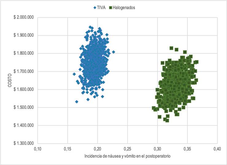 No obstante, cuando se analizan de manera estocástica los resultados, se encuentra que a pesar de que existe una alta consistencia en las incidencias del evento NVPO, los costos asociados a cada técnica anestésica tienen una variación muy similar entre ambas. Esto lleva a que la diferencia de costos de las intervenciones analizadas sea incluso de cero pesos en más del 50 % de las simulaciones realizadas y cuando la diferencia del riesgo de NVPO aumenta.