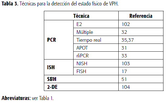 Aunque han sido desarrolladas diferentes técnicas cualitativas y cuantitativas (tabla 3), la PCR es la más empleada en la identificación del estado físico de VPH. Inicialmente la categorización por PCR se basaba en la amplificación del gen E2, la ausencia o presencia de producto amplificado representaba las formas integradas y episomales respectivamente; sin embargo, esta técnica no permitía discriminar las formas episomales de las mixtas ya que en ambos casos se obtenía producto amplificado. Actualmente, la discriminación de los tres estados físicos por PCR múltiple y en tiempo real se basa en la cuantificación de la relación E2/E6; en formas integradas puras no se observan amplímeros correspondientes a E2, en formas episomales puras la relación de E2 y E6 es equivalente, mientras que en formas mixtas se genera menor señal para E2 respecto a E6.