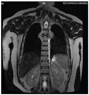 Figura 2 Resonancia magnética de columna dorsal en secuencia T2 corte coronal que muestra lesión ósea blástica en T5 que afecta cuerpo vertebral, pedículo, apófisis transversa y unión costo vertebral derecha condicionando disminución del diámetro intervertebral.