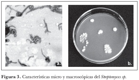 Según el porcentaje de representatividad, el género Streptomyces (figura 3) fue el más abundante, resultado que concuerda con lo reportado por Zaitlin et al. (2004), quienes sostienen que el género es dominante dentro de las comunidades microbianas edáficas de actinomicetes y reportan su amplia distribución y una tasa más alta de aislamiento.