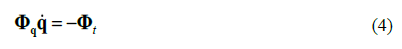 Where Φq is the Jacobian matrix of the restriction equations, is the vector of speeds to be found, and Φ t is the partial derivative of the constraint equations with respect to time.