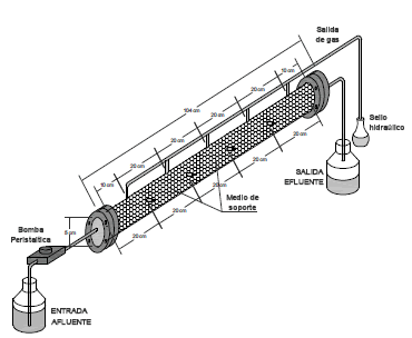 El reactor RAHBI se construyo en acrílico con una longitud de 100 cm, diámetro de 5 cm, lo que resulto en un volumen total aproximado de 1964 mL. Se instaló en una cámara revestida de icopor, termo controlada por un termostato electrónico para mantener la temperatura media en 30±2 ºC. Antes de la alimentación del reactor, el agua residual (mezcla del efluente acido con el efluente alcalino) era ajustada para mantener un valor de pH en torno de 7,0±0,5. Así mismo, y conforme encontrado en la literatura [6] para mantener la relación DQO:N:P igual a 500:5:1, fue adicionada urea y fosfato monobásico de sodio.