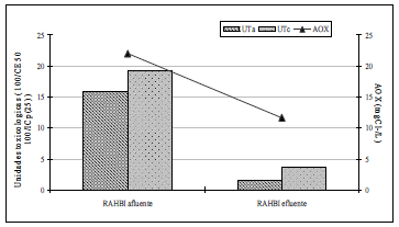 Otras explicaciones se pueden considerar, por ejemplo, que una fracción de los AOX, principalmente la fracción de alta masa molecular, no hidrolisable, sea retenida en el medio de soporte, y como consecuencia se tendría menor concentración en la fase liquida. Ese mecanismo ya fue reportado por [25]. No obstante, es importante resaltar que los fenómenos que influyen en la degradación anaerobia de los AOX y su relación con la presencia de efectos tóxicos y mutagénicos, aún es poco entendida.