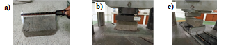 Figure 3 a) Morphology, b) compression test, and c) bending test on cobbles.