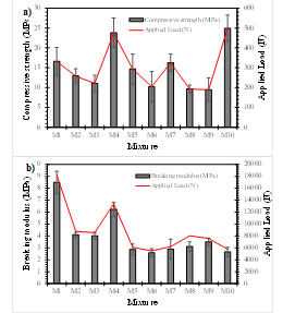 Figure 5 Results of a) Compressive strength and b) Breaking modulus versus the applied load for all the mixtures.