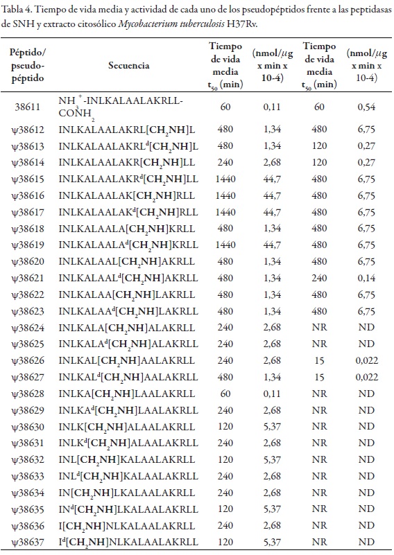 Los resultados de resistencia al ataque por parte de las proteasas obtenidos para cada uno de los pseudopéptidos sintetizados al igual que para el péptido nativo se muestran en la tabla 4; además, se presentan los geles obtenidos a manera de ejemplo para el péptido nativo y para uno de los pseudopéptidos en la figura 5. Como puede observarse en la figura 6, la sustitución sistemática de enlaces peptídicos de la secuencia del peptido antibiótico denominado Mastoparán MP-8, evidenció que algunos de los análogos producidos evadieron totalmente la actividad hemolítica propia de la molécula nativa MP-8. Los resultados de hidrólisis obtenidos frente al suero normal humano muestran que el tiempo de hidrólisis del péptido nativo es de 60 minutos; contrario a ello se observa que todas las modificaciones indujeron resistencia a la hidrólisis de proteasas, dando como resultado valores en actividad específica superior a la hallada para el péptido nativo. Además, se pudo determinar que las modificaciones realizadas hacia el extremo carboxilo de la secuencia fueron los pseudopéptidos que indujeron mayor resistencia a la hidrólisis enzimática por parte de las endo- y exopeptidasas presentes tanto en el SNH como en el extracto citosólico de Mycobacterium tuberculosis H37Rv. En la misma tabla se puede observar claramente el efecto de una modificación quiral en estas moléculas, puesto que en la mayoría de ellas el tiempo de degradación del pseudopéptido modificado con un aminoaldehído de configuración D fue mayor al de su análogo de configuración L, lo cual coincide con lo esperado, ya que el SNH y el extracto citosólico no presentan proteasas para hidrolizar enlaces en los que se encuentren involucrados aminoácidos de configuración D.