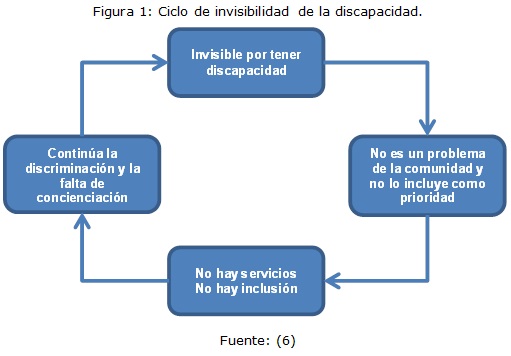 Para describir el problema de acceso a las TIC de las personas con discapacidad, Sánchez (6) retoma del Banco Mundial llamado "el ciclo de la invisibilidad" (Figura 1), a través del cual se pone de manifiesto que las personas con discapacidad son excluidas muchas veces de las políticas de cooperación al desarrollo, como si fueran invisibles.