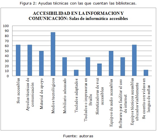 En la figura 2 se muestran las ayudas técnicas con las que se cuentan en las bibliotecas en relación a la accesibilidad en la información y comunicación. Como aspectos negativos se encuentran la falta de hardware y adaptaciones para facilitar el acceso a los ordenadores de personas con otros tipos de discapacidades, como por ejemplo interruptores de encendido del CPU y del monitor con adaptaciones, ratones adaptados, digitalizadores de voz, hardware de reconocimientos de voz, entre otros, que no se están respondiendo a las particularidad de toda la población con discapacidad, conduciendo a una baja oferta de servicios y recursos, lo que a su vez lleva a perpetuar el ciclo de invisibilidad, exclusión y autoexclusión.