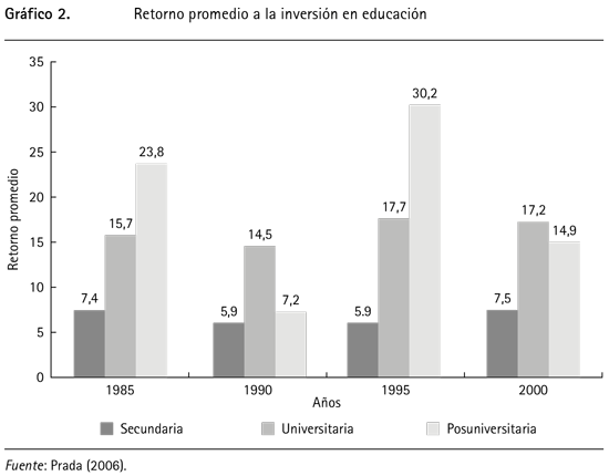 Si se toma en cuenta el ámbito educativo, vale la pena destacar a Prada (2006), quien calculó para diferentes años el retorno promedio a los distintos tipos de educación en las zonas urbanas de Colombia, al medir la incidencia de distintas variables sobre los salarios promedio de los individuos. Como se muestra en el gráfico 2, a mayor nivel educativo, mayores son los salarios. Se puede notar que, en términos generales, la educación universitaria tiene un mayor retorno que la secundaria. Sin embargo, en el caso de la educación posuniversitaria se destacan diferentes resultados, que varían de acuerdo con los años utilizados para el cálculo.