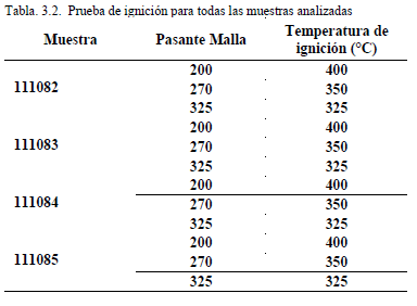 Como se puede observar en la Tabla 3.2, el tamaño de la partícula incide en la temperatura de ignición. En general las muestras más finas, pasante malla 325 son las primeras en generar características para encenderse, pero con la particularidad de no mostrar superficie enrojecida. Es notorio el agrietamiento que sufre la muestra tras la liberación de material volátil generando un ligero olor a quemado.