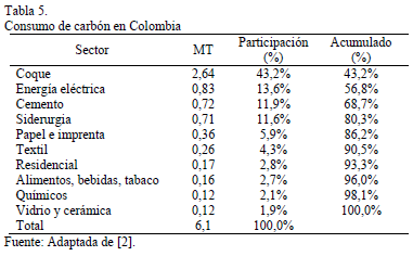 Respecto a la demanda de carbón para comercializar y distribuir, esta responde fuertemente a factores climáticos, a la promoción del uso de otras formas de energía, y a la percepción negativa frente a la contaminación que resulta de su combustión. [1]. En el ámbito nacional, los departamentos de Boyacá y Cundinamarca se ubican como los mayores consumidores del producto, con el 56,0% del consumo total del país. Asimismo, es notorio el decremento de consumo del 86,9% entre 2003 y 2014 en Norte de Santander debido a la disminución de los requerimientos por parte de Termotasajero. Igualmente el departamento de Valle del Cauca ha presentado una disminución en su consumo de 29,1% [2]. La Tabla 5 expone a los sectores que consumen mayor cantidad de carbón en Colombia, de los cuales resaltan la industria del coque y de generación de energía electica, que abarcan el 56,8% del mercado.
