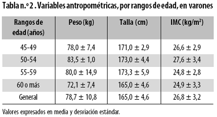 Variables antropométricas:la población evaluada presentó los siguientes valores medios: edad 51,4 ± 6,4 años; peso corporal 72,0 ± 13,4 kg; talla 165,0 ± 9,2 cm. El Índice de masa corporal (IMC) fue de 26,6 ± 3,4 kg/m2 lo que corresponde a sobrepeso tipo I. Los varones tuvieron IMC mayores, con 26,8 ± 3,2 kg/m2, frente a 24,5 ± 3,2 kg/m2, de las mujeres (Tabla n.º 1). Las diferencias entre hombres y mujeres en estas cuatro mediciones no fueron significativas.