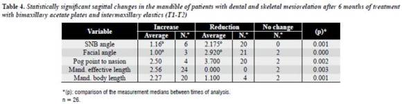 The most significant changes were represented by an increase in both anterior cranial base length and mandibular effective length, which agrees with the studies by Ferro et al.,20 who pointed out that longterm stability of this kind of treatment was related to the degree of intercuspidation achieved, and that recurrence was directly related to mandibular ramus growth after treatment.