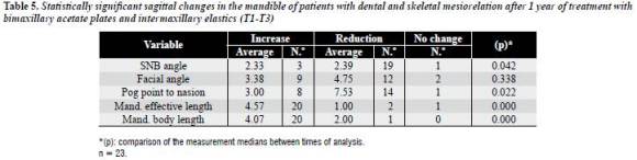 Concerning the mandible in the sagittal plane, all of the measurements showed statistically significant changes between T1 and T2 (table 4); an increase in effective length and in mandibular body length was observed along with a reduction in SNB angle, facial angle and pog point perpendicular to N. Between T1 and T3 (table 5), even though it was not statistically significant, facial angle decreased in 12 patients (4.75° on average) and the SNB angle was reduced in 19 of the 23 patients of the sample (2.39° on average) with an average increase of 4.57 mm in mandibular effective length and 4.07 mm in mandibular body length (20 patients).