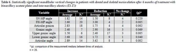 At the mandibular level in the vertical plane (table 6), statistically significant changes occurred during the first 6 months of treatment in the FH-MP angle measurements (clockwise rotation), the Ar-Go distance (branch length), the upper goniac angle and the Ar angle.