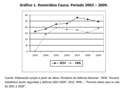 En cuanto a violaciones al derecho a la vida, expresadas a través de la tasa de homicidios, es necesario mencionar que, tal y como puede evidenciarse, existen diferencias entre los datos manejados por las fuentes oficiales utilizadas. En el caso de INML, los datos en términos relativos presentan para el periodo una disminución, aunque no es una disminución constante a través de los años. Sin embargo, es necesario mencionar que los informes de resultados de la Política de Seguridad Democrática, presentados por el gobierno nacional anualmente al Congreso de la República, se basan en los cálculos que el Ministerio de Defensa Nacional (MDN) realiza en relación a los registros de la Policía Nacional. Siguiendo dichos datos, el departamento del Cauca, en contravía a los resultados nacionales, presenta un aumento general y constante año tras año, teniendo como pico el año 2007, con una tasa de 55,8 homicidios pch. Lo anterior significa que la vulneración del derecho a la vida de la población del departamento del Cauca es permanente, cuya tasa al final del periodo de 48,73 casos pch supera la tasa nacional, presentando un aumento sostenido durante todo el periodo, finalizando el mismo con una tasa de homicidios significativamente más alta a la que había cuando inició la ejecución de la Política de Seguridad Democrática.