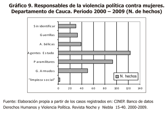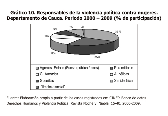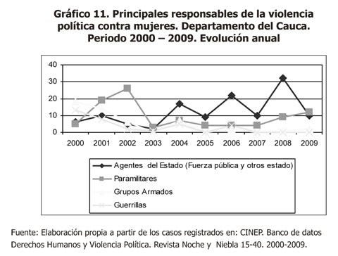 La ejecución de actos violentos contra las mujeres por parte de los grupos armados, grupos sin identificar y guerrillas es significativa en el periodo comprendido entre 2002 y 2004, reduciendo drásticamente entre 2005 y 2009. En cuanto a los grupos paramilitares, se evidencia una comisión alta de delitos contra las mujeres entre 2000 y 2002, disminuyendo entre 2003 y 2006, e incrementándose nuevamente desde 2007, lo que permite evidenciar de un lado que los grupos paramilitares no han dejado de operar en el departamento del Cauca y, sobre todo, que han venido incrementando nuevamente su accionar afectando claramente a las mujeres, todo esto, pese al proceso de desmovilización y reinserción llevado a cabo entre 2002 y 2005 por el gobierno nacional.