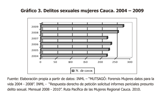 - La violencia sexual en el departamento del Cauca registró un crecimiento mínimo a lo largo del periodo pero continuo. Solo en 2007, se registró una disminución. 1.434 casos de violencia sexual física contra mujeres se presentaron durante el periodo 2002-2009 en el departamento del Cauca, lo que implica que entre 18 y 23 mujeres fueron violentadas sexualmente cada mes. Según estos datos, aproximadamente una mujer sufrió este tipo de violencia cada día y medio, acercándose al final del periodo a una diaria. No obstante, este dato, aunque inferior en relación a los promedios nacionales, resulta preocupante si se tiene en cuenta que en el país, en los municipios en donde existe presencia de actores armados, menos del 20% de las mujeres denuncian los hechos de violencia sexual de los que han sido víctimas (Corporación Casa de la Mujer, 2010, p. 3), aspecto particularmente relevante en el departamento del Cauca, si se tiene en cuenta que todos sus municipios tienen presencia de al menos dos actores armados.