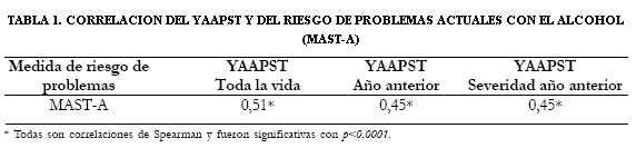 Con el fin de estimar la validez de criterio concurrente, se correlacionaron los resultados del MAST-A y el YAAPST en sus tres formas de calificación. La Tabla 1 muestra los productos de las correlaciones de Spearman para los puntajes del YAAPST y de una de las pruebas consideradas como mediciones adecuadas de problemas con el uso del alcohol.