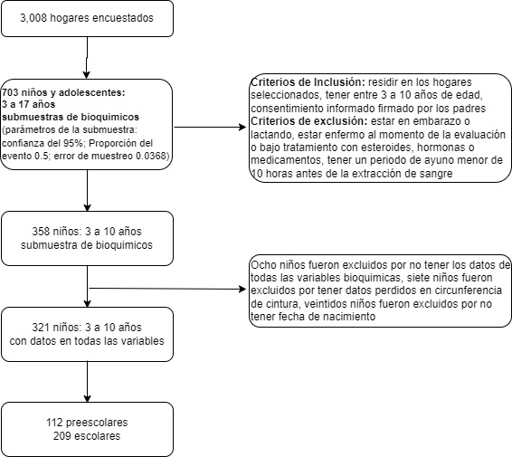 Este es un estudio transversal con 321 niños divididos en preescolares (3 a 5 años) y escolares (6 a 10 años) residentes en Medellín-Colombia. Los niños participaron en la Encuesta Alimentaria y Nutricional de Medellín 2015 (Perfil de seguridad alimentaria y nutricional de Medellín y sus corregimientos) 18. Se encuestaron un total de 3008 viviendas de los seis estratos socioeconómicos de la ciudad. Se incluyeron en el estudio niños de 3 a 10 años, que no estuvieran en estado de gestación o lactancia, cuyos padres o adultos responsables firmaron el consentimiento informado. Se excluyeron del estudio los niños que se encontraban enfermos en el momento de la evaluación o en tratamiento con esteroides, hormonas o medicamentos. Asimismo, se excluyeron del análisis los niños que presentaron un ayuno menor de 10 horas antes de la extracción de sangre. Finalmente, se incluyeron 321 niños (entre 3 y 10 años) (Figura 1). El estudio se realizó de acuerdo con la Declaración de Helsinki y fue aprobado por el Comité de Bioética de la Facultad de Odontología de la Universidad de Antioquia (Acta de aprobación N° 01. 27 de febrero de 2015).