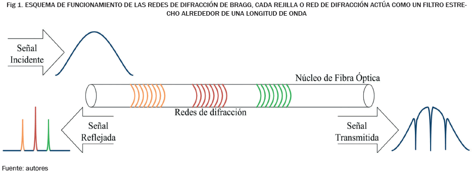 Los sensores basados en FBGs son una fibra óptica a la que se le ha introducido una perturbación periódica en el índice de refracción de su núcleo. Esta perturbación es usualmente inducida por la exposición de la fibra a un patrón de luz ultra violeta generado por una máscara de fase. Debido a la periodicidad de esta perturbación, una longitud de onda específica se verá filtrada cuando es transmitida a través de la fibra óptica. Este hecho convierte automáticamente a la fibra óptica en un elemento sensor dado que las variables externas que afectan el entorno de la fibra óptica tienen un efecto en la periodicidad de la perturbación.