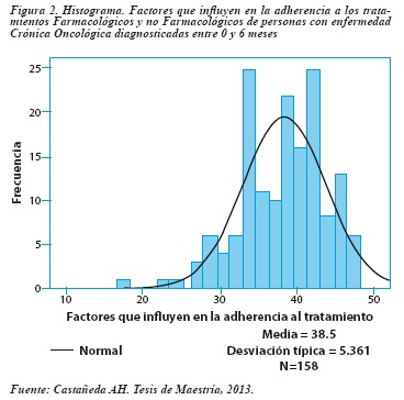 La sumatoria global del Instrumento para evaluar los factores que influyen en la adherencia a los tratamientos farmacológicos y no farmacológicos en pacientes con riesgo de enfermedad cardiovascular. Cuarta versión, mostró una media de 38,5 (DE 5,36), clasificación correspondiente a un bajo riesgo de no adherirse al tratamiento, lo que a la vez representa ventaja para la adherencia. La distribución de la variable fue normal y los valores extremos fueron 48 y 18 puntos. La Figura 2, muestra el comportamiento de la variable.