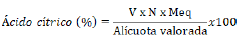 Meq = miliequivalente del ácido que se encuentra en mayor proporción de la muestra (0.064 para ácido cítrico).