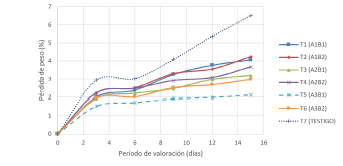 La figura 2 presenta la pérdida de peso en cada uno de los tratamientos, considerando el tiempo de almacenamiento. Resultados similares se han encontrado en numerosas investigaciones (Achipiz et al., 2013; Zebadúa et al., 2005; Quila, 2003; Possel, 1992), donde se determina que la pérdida de peso se incrementa en la medida en que se incrementa el tiempo de almacenamiento.