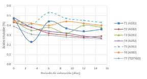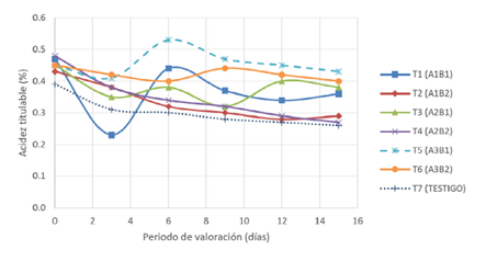 El análisis de varianza para la acidez titulable demuestra diferencias entre los tratamientos en estudio. Por otro lado, el test de Tukey al 0.05% selecciona a T5 como mejores tratamientos, ya que mantiene valores de 0.46 y T6 con igual concentración de Aloe vera con un 0.43%. De la misma manera, se encuentra al tratamiento sin recubrimiento (T7) con el menor valor promedio durante el almacenamiento, lo cual indicaría que el proceso de senescencia se está desarrollando, tal como mencionan Saradhuldhat y Paull (2007) sobre la baja concentración de azucares y desaparición del ácido en la guayaba. Al respecto, la figura 4 se muestran los valores de cada tratamiento durante cada una de las evaluaciones durante el periodo de almacenamiento.