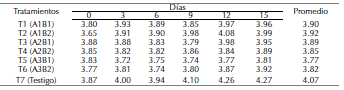 Este parámetro debe su variación a la degradación de los ácidos orgánicos en el ciclo de Krebs en los primeros estados de la maduración, cuando la concentración de azúcares es baja y ocasiona la desaparición del sabor ácido del fruto (Saradhuldhat y Paull, 2007). La tabla 5 presenta las mediciones de acidez titulable en cada tratamiento y días de evaluación, así como también los promedios alcanzados. Conforme a estos, es posible observar que la acidez titulable baja con el tiempo de almacenamiento. Es importante indicar que este parámetro mantiene una correlación negativa con los sólidos solubles totales.