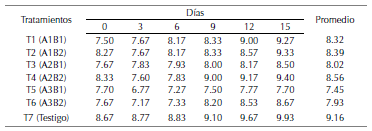 El test de comparación de medias de Tukey presentó diferencias entre los tratamientos motivo de estudio (p<0,05). Siendo T7 el tratamiento con mayores valores registrados, llegando hasta un máximo de 4.27 comparados con los tratamientos con recubrimiento, los cuales mantenían pH relativamente bajos. El menor pH se encontró en el T5 con valores máximos de 3.83 al inicio del periodo de evaluación y un promedio de 3.77, siendo el mejor tratamiento por su eficiencia para mantener el pH bajo. Al respecto, se debe indicar que el pH durante el almacenamiento demuestra la senescencia del fruto.