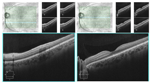 Figura 1 A). Tomografía de coherencia óptica de ojo derecho con grosor coroideo normal de 301 micras. B).Tomografía de coherencia óptica de ojo izquierdo. Se evidencia separación de las capas de la retina en relación con la coroides en diferentes ubicaciones de la retina; imagen de la fóvea evidencia ligero aumento del grosor coroideo de 482 micras en comparación con ojo derecho.