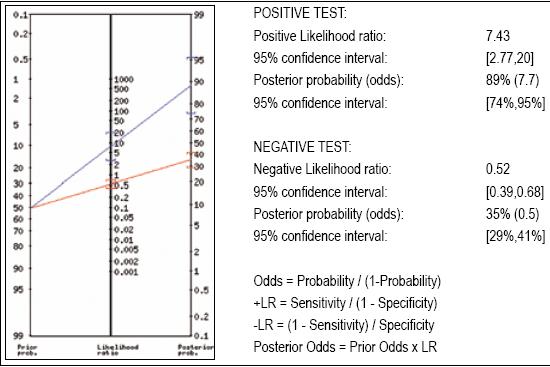 Figure 1. Nomogram of pretest and posttest probabilities for two and three positive criteria.