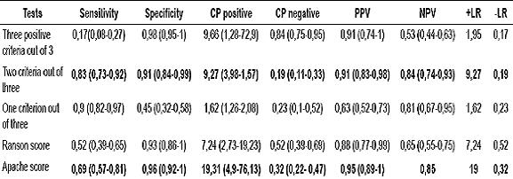 Table 4 shows differences in predictive values for these patients among the uses of one, or combinations of two, or three of the proposed criteria and existing scores. It is evident that the positivity of two criteria contributes to higher sensitivity (83%) than the Apache test (69%), and specificity (91%) which is comparable to that of the Apache test (96%). Both positive criteria offer a better negative predictive value.