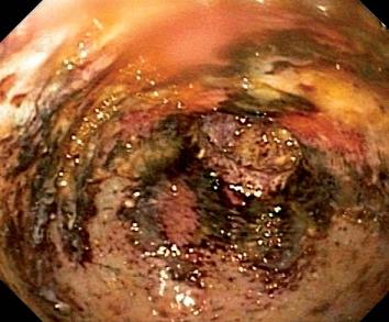 A 25 year old woman who had been healthy arrived at the intensive care unit because of heartburn and posterior abdominal pain following prior to attempted suicide by voluntary ingestion of muriatic acid. Upon admission the patient was in pain and experiencing tachycardia. She had mild epigastric pain but no signs of peritoneal irritation or other symptoms upon physical examination. The laboratory tests showed an important leukocyte reaction in the complete blood count. A chest x-ray and high digestive tract endoscopy were performed. The thorax x-ray showed no alterations, but endoscopy found evidence of III or IV degree burns on the Zargar scale in the esophagus and stomach (Figures 1, 2, 3 and 4). Since there was a high risk of perforation, it was decided not to use a nasogastric feeding tube, but to use parenteral nutrition instead.