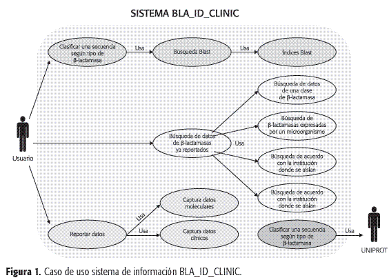 Se diseñó el diagrama de casos de uso para el sistema BLA_ID_CLINIC (Figura 1) en el cual, tomando en consideración el punto de vista de un usuario, se definieron tres módulos que integran los datos moleculares y los datos clínicos, permiten la clasificación de la ß-lactamasa usando métodos bioinformáticos, reportan los datos moleculares y clínicos y, lo más importante, permiten recuperar los datos que facilitan el seguimiento de las ß-lactamasas a varios niveles, como se describe a continuación: