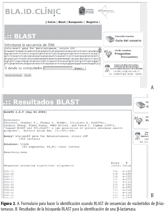 El seguimiento epidemiológico y farmacológico de la resistencia a antibióticos ß-lactámicos mediada por la presencia de ß-lactamasas requiere identificación precisa, lo cual es posible mediante la secuencia del gen, que es identificado con herramientas bioinformáticas que se incorporan a sistemas de información. Para implementar un prototipo de sistema de información que permite clasificar secuencias de genes de ß-lactamasas producidas por microorganismos resistentes aislados en hospitales y realizar su cruce con los datos clínicos, se obtuvieron las secuencias de ß-lactamasas reportadas a escala mundial en la base de datos Uniprot utilizando el sistema de recuperación de secuencias (SRS) del Instituto Europeo de Bioinformática (EBI), se diseñó un sistema de datos moleculares y clínicos usando "Unified Modeling Language" (UML), y se generó un modelo implementado en un servidor con sistema operativo UNIX, gestor de bases de datos MySQL para realizar la creación de la base de datos y lenguajes de programación Perl y PHP para implementar programas y cruzar datos. El sistema de información BLA_ID_CLINIC permite hacer el cruce de datos moleculares y clínicos, de tal forma que se puedan identificar las ß-lactamasas de microorganismos resistentes en hospitales y hacer un seguimiento del manejo de los antibióticos y el comportamiento epidemiológico, modelo bioinformático permanentemente actualizado, disponible a través de Internet en http://bioinf.ibun.unal.edu.co/BLA_ID_CLINIC.