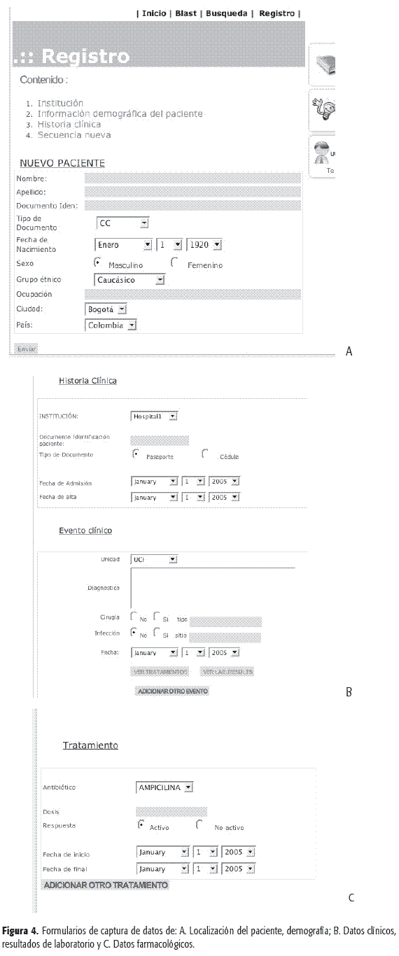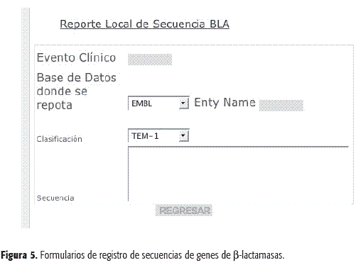 Módulo 3. Reporte de datos de ß-lactamasas. Si se toma en cuenta que uno de los mayores problemas en nuestro medio, para el seguimiento de la aparición de la resistencia bacteriana, es la falta de sistemas que permitan documentar los datos relativos a ésta, se desarrolló un conjunto de formularios para realizar el registro de la información asociada con el sitio donde se encuentra el paciente; su información demográfica; los datos clínicos; los resultados de laboratorio y los datos farmacológicos (Figura 4). Estos formularios permiten enviar la información a la base de datos, en la medida en que éstos se van produciendo en el ámbito clínico o de laboratorio. El módulo de registro también incluye el almacenamiento de secuencias de ß-lactamasas aisladas e identificadas en nuestro medio, para lo cual se diseñó un formulario que permite capturar la información molecular (Figura 5).