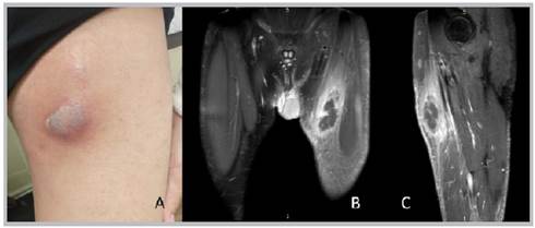 Figure 1 A: a photograph of the anterior internal aspect of the left thigh showing an abscess in the vertex of Scarpa's triangle. B: magnetic resonance imaging, coronal section, C: sagittal section showing an abscess and area of pyomyositis in the left thigh..
