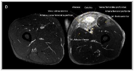 Pyomyositis 1 is an acute bacterial infection of the skeletal muscle with abscess formation. The incidence is 33-40%, mainly in young adult males. Staphylococcus aureus is responsible for 90% of the cases 2. It occurs due to dissemination from a distal infection or direct extension from an adjacent process. It has three phases: a) invasive: one to two weeks; b) purulent: the next 1021 days (90% of the patients consult at this stage); and c) systemic inflammatory response 3. A culture of the secretion and diagnostic ultrasound are required 4; magnetic resonance imaging is the test of choice 5. It is initially treated with antibiotics and requires surgical drainage in the second and third stages. Broad spectrum coverage is used in patients with comorbidities or immunosuppression, including Gram negative and anaerobic coverage. The reported mortality ranges from 2 to 20%, and is highest in patients with comorbidities.