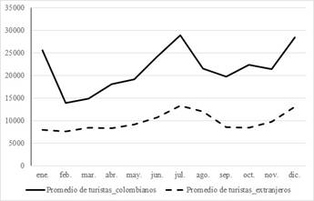 La exploración de los promedios de turistas por mes, que se observan en el Gráfico 4, refuerza el análisis de la incidencia de dicho factor sobre las series, pues se aprecia que en los meses de junio, julio, enero y diciembre es mayor el total de turistas colombianos, mientras que en los meses de julio, agosto y diciembre vienen más turistas extranjeros, ya que estos meses corresponden a las vacaciones de los países respectivos.