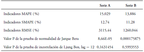 Variables respuesta: Serie A: Turistas colombianos, Serie B: Turistas ex tranjeros. Periodo: años 2007 a 2014. N = 96, T = 72, periodos de pronós tico: 24 (2 años).