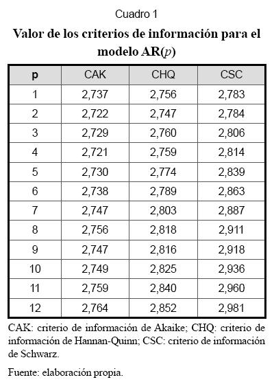 Paso 1. En el Cuadro 1 se reportan los valores los diferentes criterios de información estimados para modelos autorregresivos de orden P=1,...,12. CAK es el criterio de información de Akaike; CHQ es el criterio de información de Hannan-Quinn; CSC es el criterio de información de Schwarz. Los criterios de información utilizados permiten seleccionar el orden tentativo del modelo autorregresivo inicial; en este caso, el error está compuesto por una componente de ajuste a la muestra de datos usada para la calibración, la cual disminuye a medida que aumenta el orden del modelo, más una componente de variabilidad del error, que aumenta a medida que se incrementan los parámetros. Cada uno de los criterios de información utilizados es una aproximación a dicho error total, de tal forma que se prefiere aquel modelo que minimice el valor del criterio de información utilizado. Así el orden P del modelo AR(p) óptimo para las reglas de los consecuentes es 4.