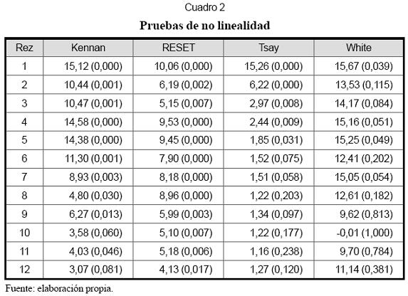Paso 2. En el Cuadro 2 se presentan los estadísticos obtenidos al aplicar las pruebas clásicas de no linealidad de Kennan, Ramsey (prueba RESET), Tsay y White, las cuales fueron descritas de forma detallada por Tong (1990). Como hipótesis nula se supone que un modelo AR(p) captura adecuadamente la dinámica de los datos, y que los residuales obtenidos son ruido blanco. Como hipótesis alternativa se plantea que existe una componente no lineal remanente en los residuales que el modelo AR(p) no fue capaz de capturar.