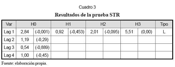 En el Cuadro 3 se reportan los resultados del contraste de no linealidad desarrollado para los modelos STR. En primer lugar, se parte de la hipótesis nula de que un modelo AR(p) es adecuado para modelar la serie frente a la hipótesis alternativa de que existe una componente no lineal remanente en los datos, la cual podría capturarse de manera adecuada por un modelo STR.