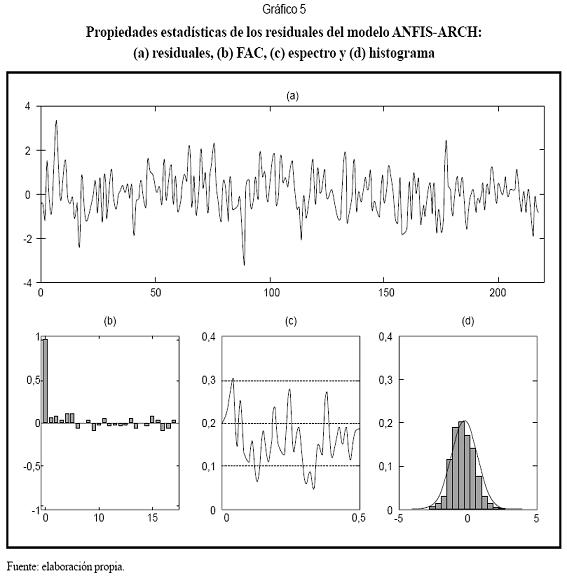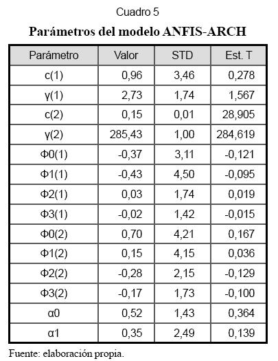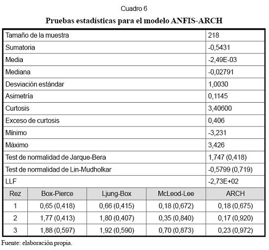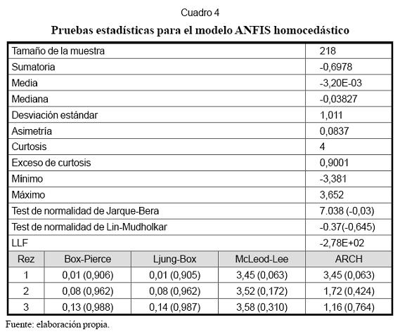 Pasos 3, 4 y 5. En el Cuadro 4 se resumen las propiedades estadísticas de los residuales obtenidos al estimar un modelo ANFIS homocedástico, esto es, con varianza constante; log L es el logaritmo de la función de verosimilitud de los residuales, que es igual a -278. El contraste de normalidad de Jarque-Bera permite rechazar la hipótesis nula en que se asume que los residuales siguen una distribución normal. Esto es consistente con el resultado de la prueba ARCH, que indica que los residuales siguen un proceso ARCH(1). La prueba de Ljung-Box señala que las autocorrelaciones de los residuales no son significativamente diferentes de cero. Este resultado indica que es necesario incorporar una componente ARCH de orden uno al modelo ANFIS.