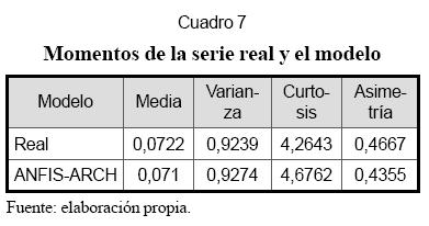 El caso analizado ejemplifica tanto el modelo ANFIS-GARCH propuesto como la metodología de especificación desarrollada. Al comparar este modelo con modelos alternativos más parsimoniosos (con menos parámetros) y más tradicionales, tal como el modelo ARGARCH, se demuestra que la aproximación aquí presentada es, en términos estadísticos, significativamente diferente y que permite modelar mejor las propiedades de la serie analizada.