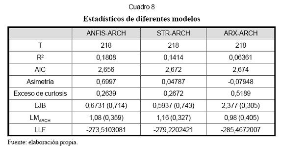 El Cuadro 8 presenta los estadísticos de diferentes modelos con los que se desea comparar el modelo ANFIS-ARCH propuesto. De acuerdo con la relación que establecen Velásquez et al. (2004) entre los modelos ANFIS y STR, los modelos STR-ARCH y ARX-ARCH, se puede afirmar que dichos modelos poseen la misma estructura de los modelos ANFIS-ARCH, a efectos de comparar el ajuste de la serie.